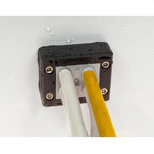 The DES Q cable entry system consists of a splittable frame designed to accommodate small (SPP), multiple (X) or large (SPG) grommets for cables with and without connectors. With all combinations of grommets, single, double, quadruple, big, the IP66 and NEMA 4X* are guaranteed. The overmolded gasket guarantees faster installation times and the complete V0 self- estinguishing of the system.