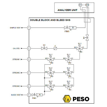 As can be seen below diagram this design allows sample flow from the selected stream to pass through two valves enroot to the sample/calibration valve. The other streams are double blocked with two valves and leakages from valves at low pressure to escape out the bleed vent.